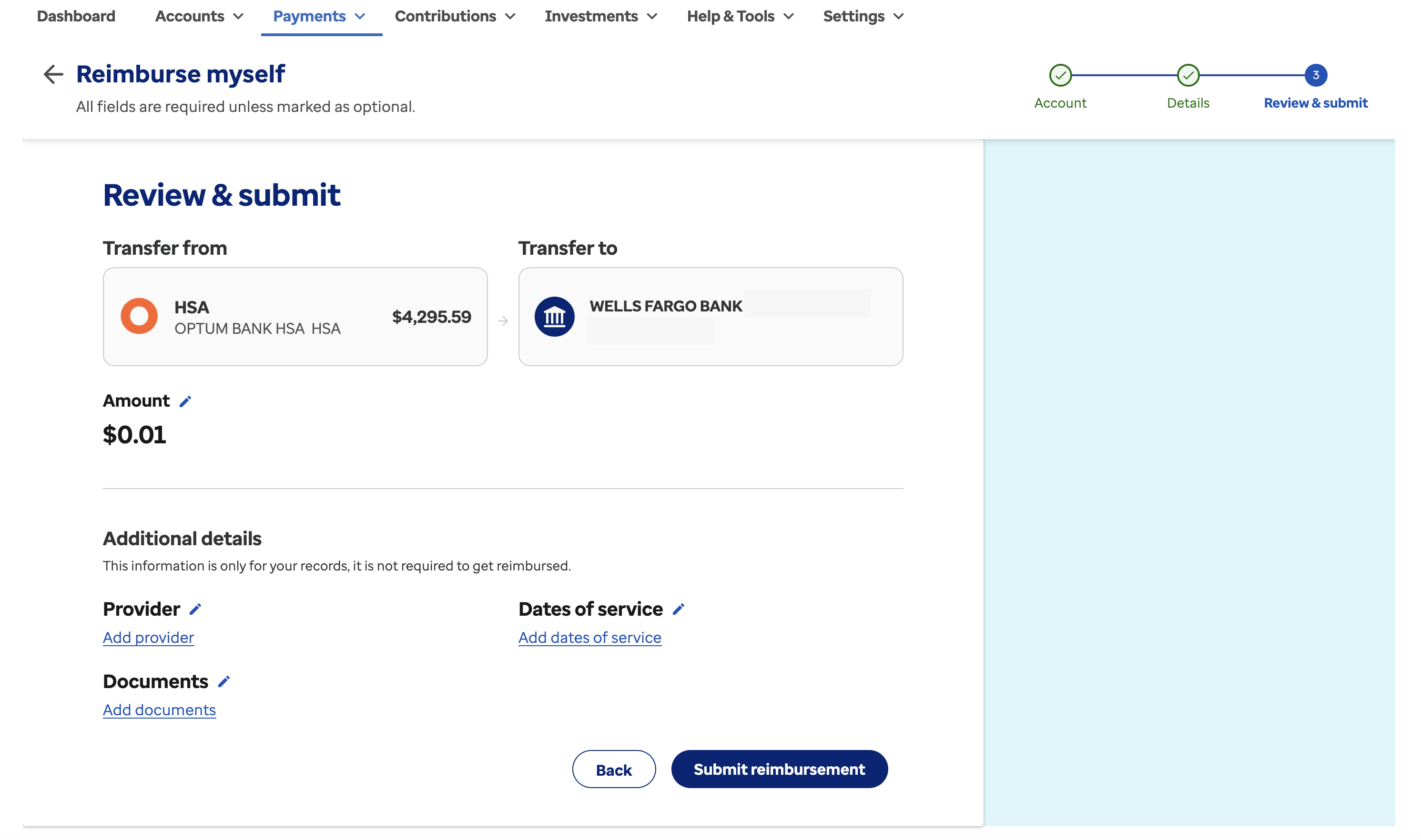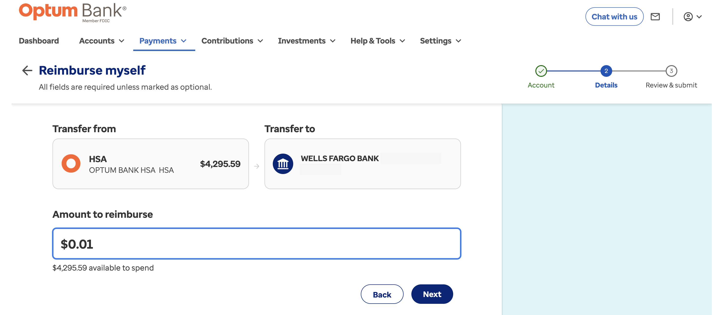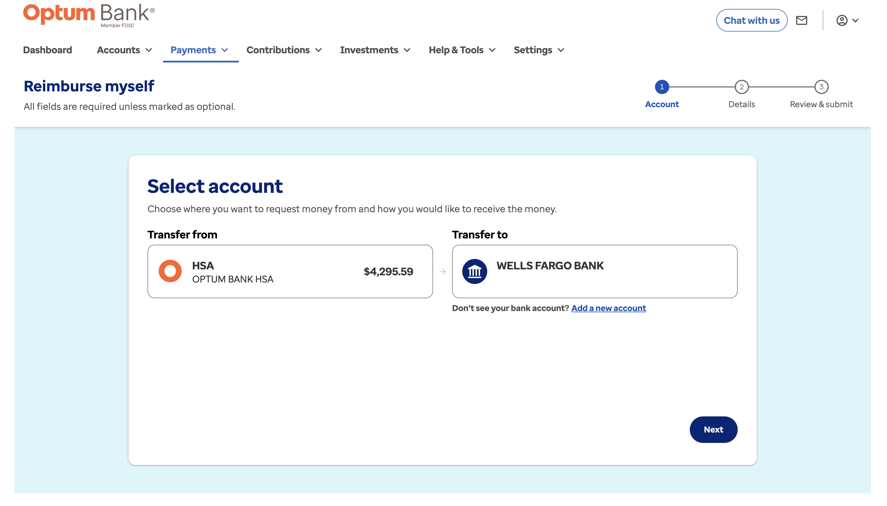 Select “Dashboard” in the top left, then select “Reimburse Myself ” below your available balance.