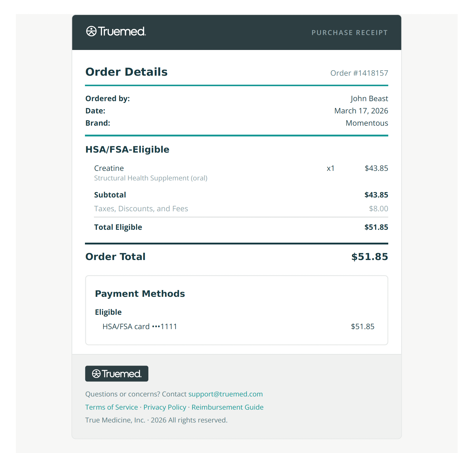 The description field is especially important. Administrators may flag receipts that use vague language like “membership,” “program,” or “class.” If you used Truemed payment at checkout, the Truemed receipt includes plain-language descriptions to help administrators recognize your purchase as an eligible medical expense. If you’re on the post-purchase reimbursement path, make sure your merchant receipt clearly itemizes what was purchased.